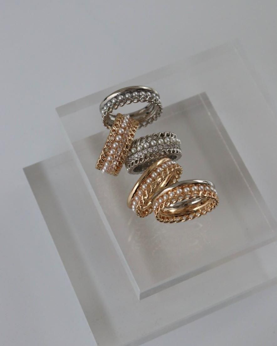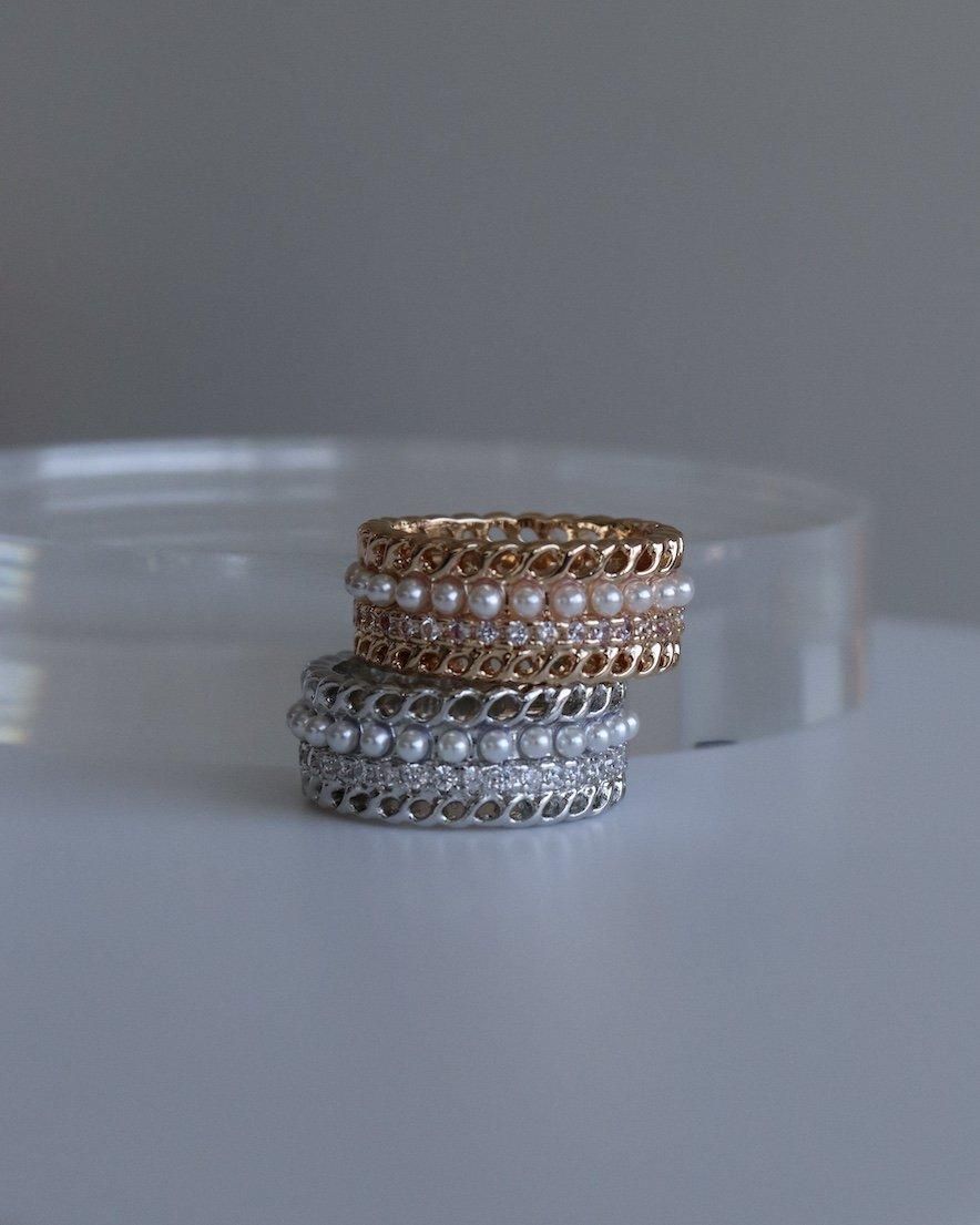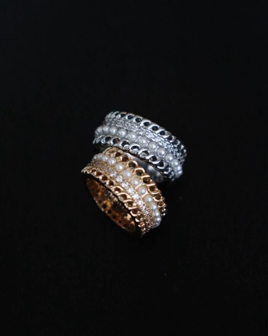 一つで存在感を与えるリングです。ビジューとパールとチェーンのデザインが交わり、指先を華奢に見せつつ華やかさを与えてくれます。