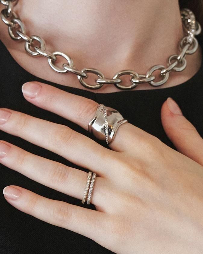 sv925の質感が際立つ、存在感のあるボリューム。ひとつで主役になる力強さを持ちながら、計算されたバランスで指に馴染みます。アート作品のような佇まいのリングです。