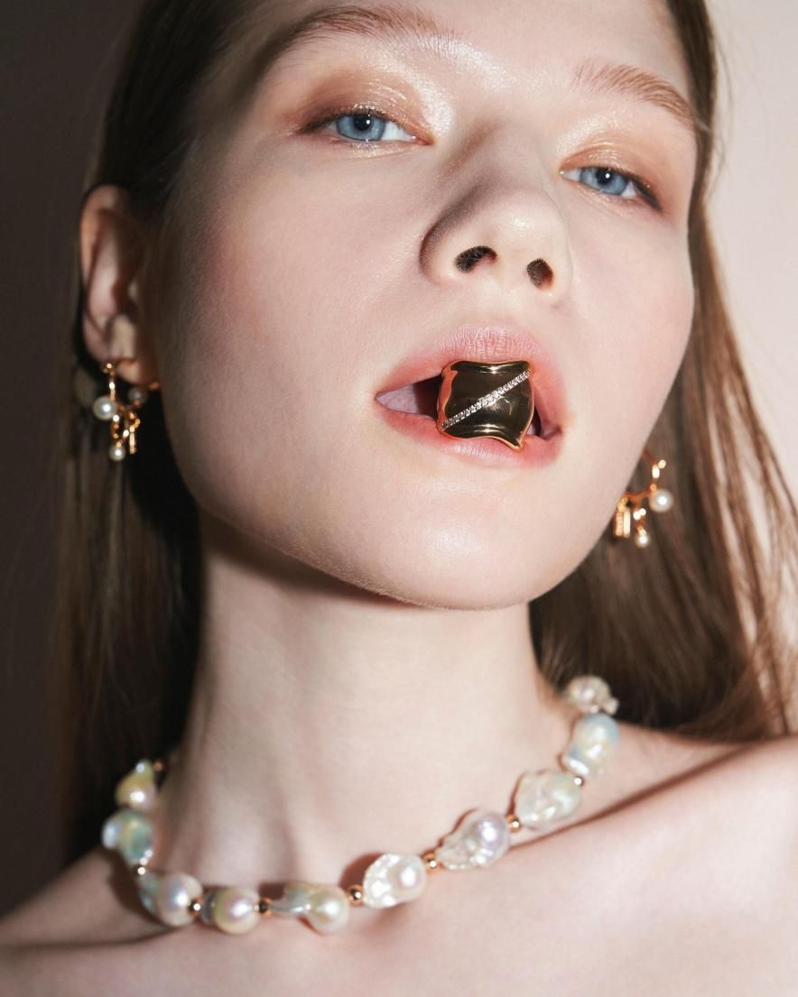 大胆にうねる曲面に、斜めにカットされたようなシャープなラインが交差します。光を受けて輝く部分と陰影のコントラストが、立体的な表情を生み出す印象的なフォルム。