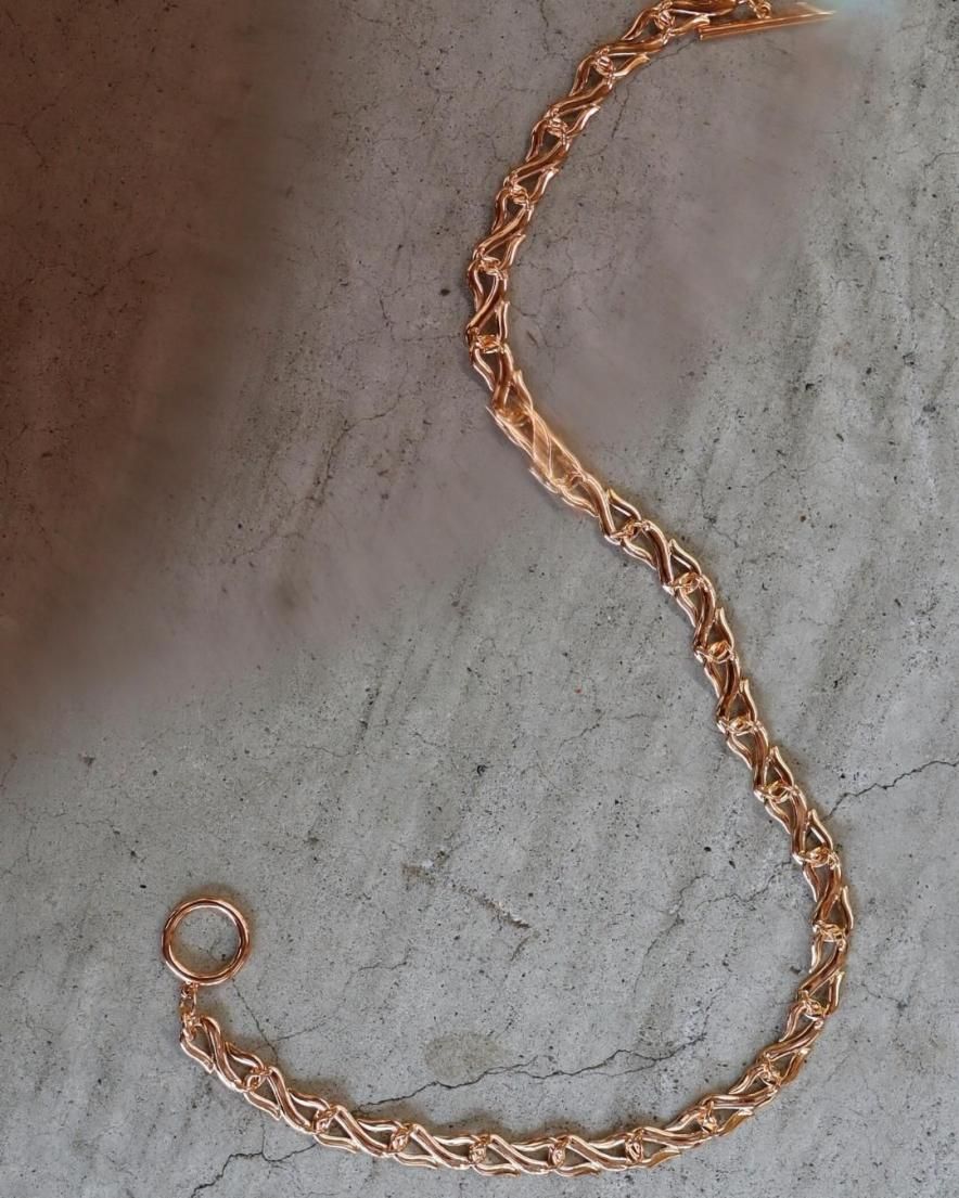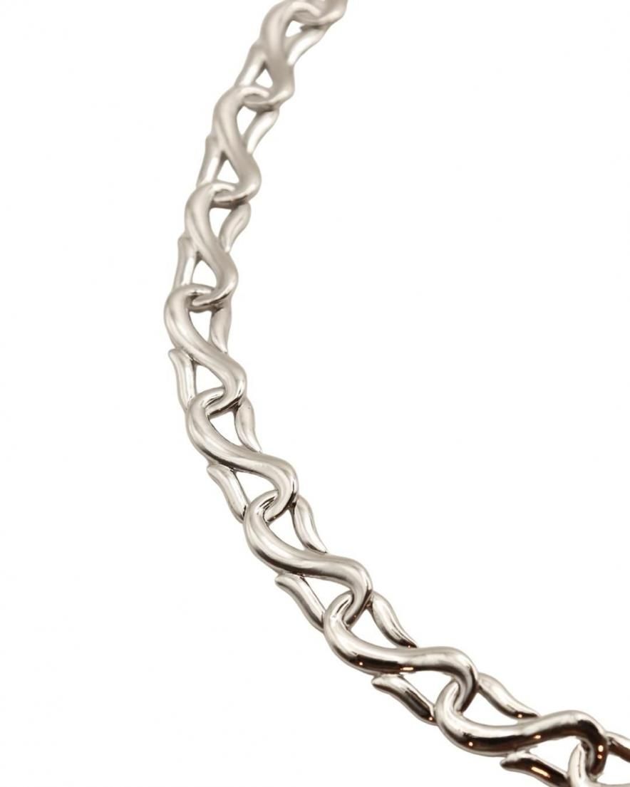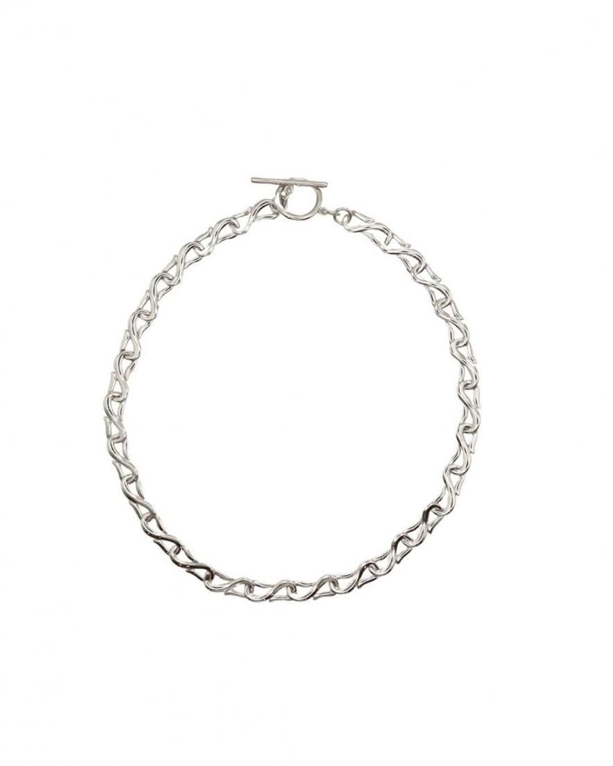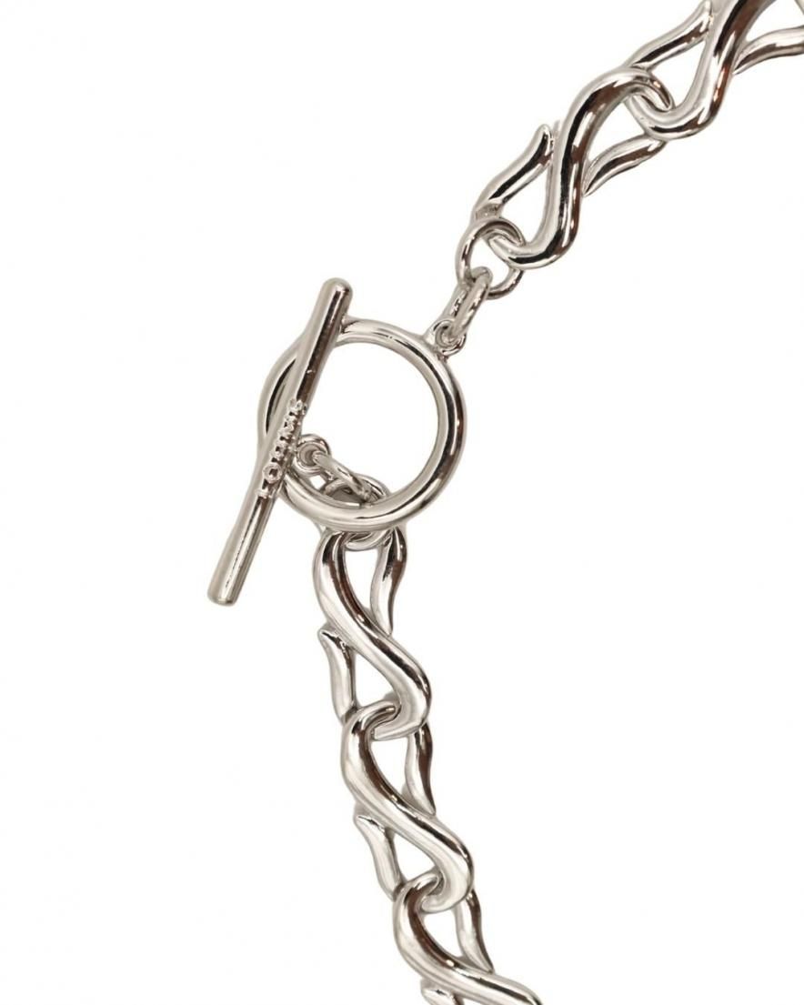 通常のチェーンとは異なる、うねりのあるフォルムが首元に動きと立体感を生み出します。角度によって表情が変わる、有機的なラインが魅力です。