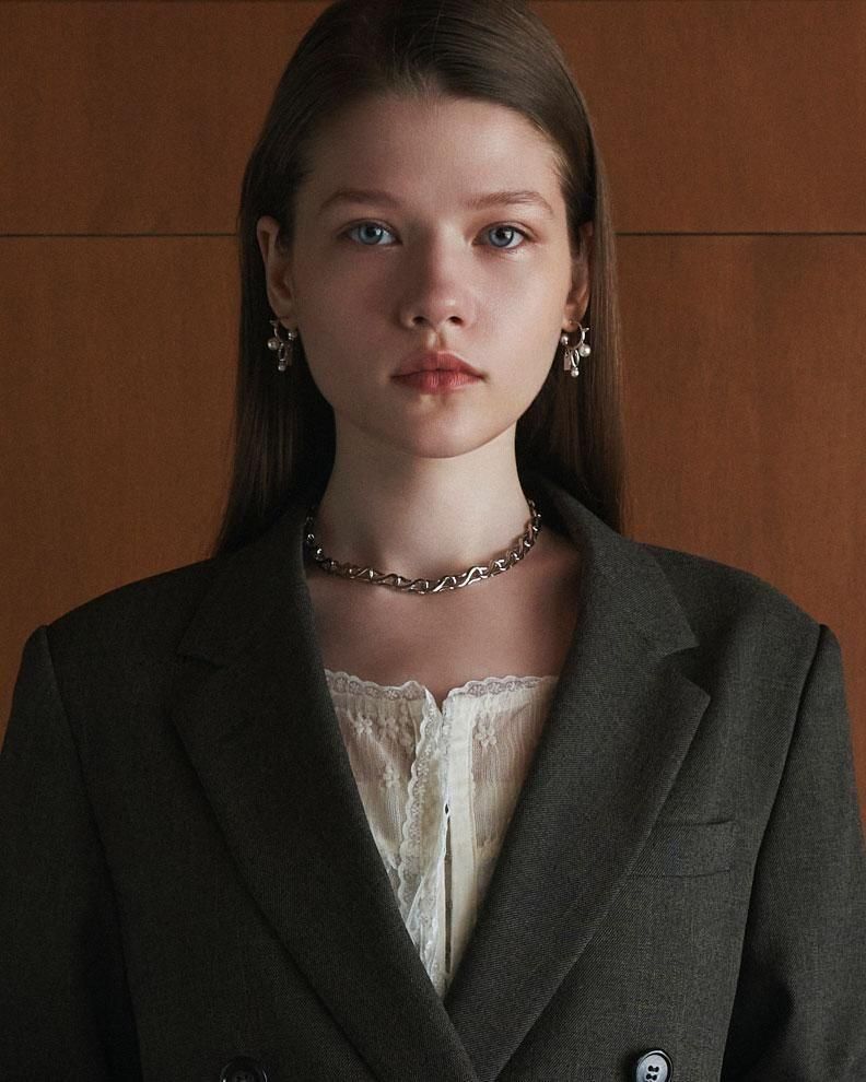 留め具部分をデザインの一部として前に持ってくることで、さりげないアクセントに。鎖骨のラインに沿うような長さで、シンプルな装いに一点投入するだけで、スタイリングが格上げされる存在感。