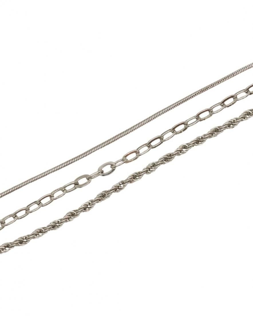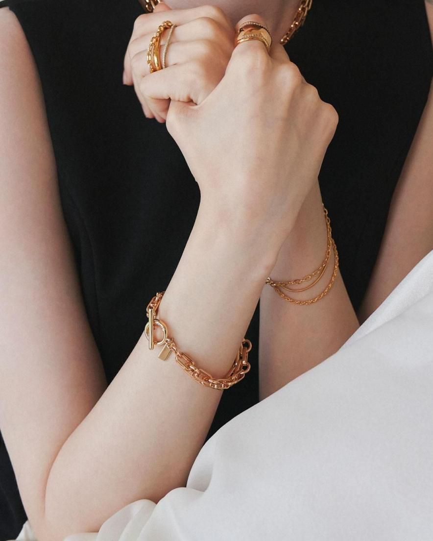 細やかな表情を持つ3種類のチェーンを一つに束ね、手元に静かな存在感を添えるブレスレット。