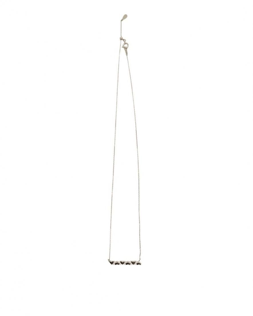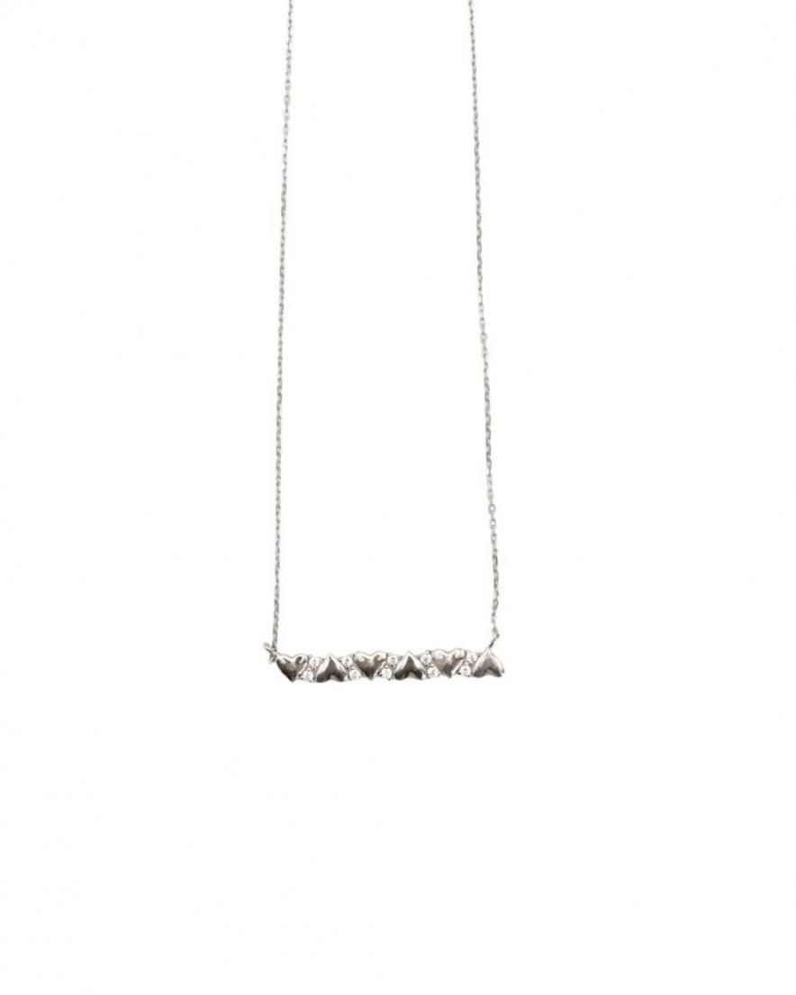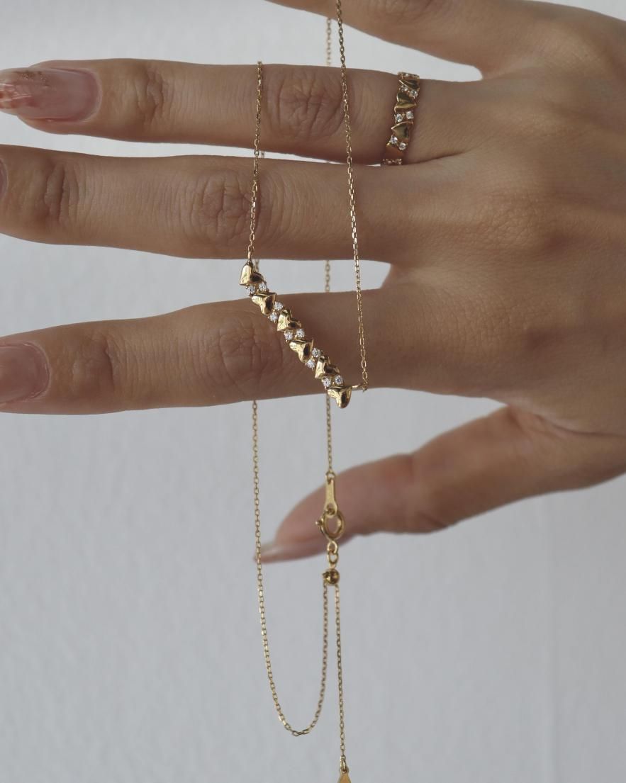 ミニマルなハートモチーフをバー状に並べ、ところどころにビジューを添えたネックレス。